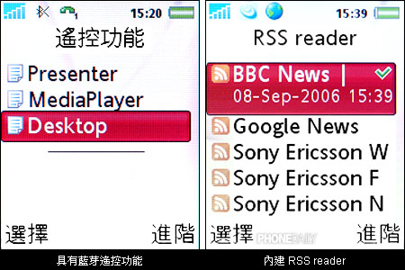 K618i 的蓝牙功能诚意十足,不但支持蓝芽立体声播放(A2DP),能搭配 HBH-DS970 立体声蓝芽耳机来聆听音乐,同时还具有遥控功能,可以远程遥控投影机等设备。此外,K618i 也配备了时下流行的 RSS 功能,配合3G网络,能够快速的接收最新信息。