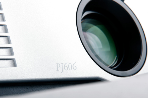 优派PJ606投影机采用传统的金属灰色机身,流线型线条,面板防滑处理,手持感觉稳重细腻,接口部分设计在机身左侧,后侧视界干净整齐。外观面板顶板和侧板一体化设计,底部面板采用黑色材质,与顶板结合紧密。外观棱角采用元化处理,过度简洁明晰。