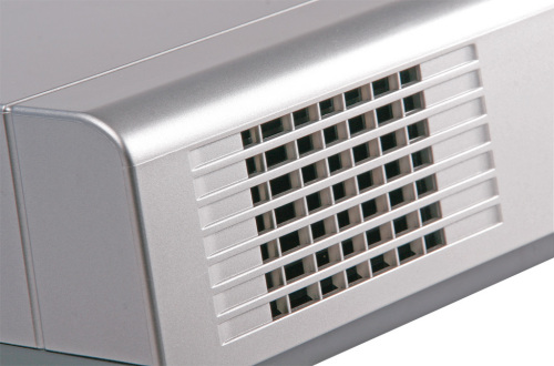 主出风孔在投影机前面板镜头一侧;主进风孔在投影机底部,其他辅助进气口分布较多,这保证了良好的散热效果