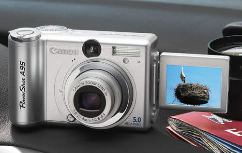 PowerShot A95采用了1/1.8英寸500万象素的CCD,感光度从ISO 50到ISO 400,具有3倍光学变焦,相当于35mm相机的38~114mm焦距段,光圈范围在F2.8(广角)~ 4.9(长焦)。液晶屏延续了深受用户欢迎的可旋转LCD显示屏,尺寸为1.8英寸,象素11.8万,取景还算清晰。