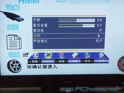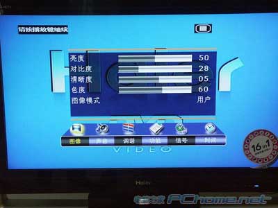 菜单显示:菜单简洁明了采用白透明设计可以对音响系统分别进行调节,在数字模式下对三原色分别进行调节。