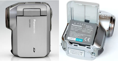 SDR-S100的输入、输出接口也位于机身后部,主要由USB2.0接口、MULTI多媒体接口和电源接口组成。标配一块型号为CGA-S303的可充电式锂离子电池,容量为760mAh,标称可以连续拍摄时间大约为80分钟,间歇拍摄时间大约45分钟