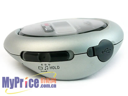 SONY的产品在外观方面都有自己的风格和定义,E103的外型看起来比较奇特,正面为圆形,而背后则为拱型,由中间的高处滑向两边低处。中间高位是电池仓,可以装入一节7号电池。机身两边是绿色的按键和USB接口,还有一个用金属包着的耳机输出接口。背面还有两个小小的按键,分别是播放模式/音效的快捷键和菜单按键。