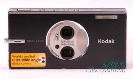 柯达V705外观延续了V系列卡片的一贯作风,纯黑色的金属拉丝机身黑白相间质感十足,巨大的镜头钢圈占据了整个相机棉正面的中间部位,V705的推出一举打破了V570保持的世界最小的23mm广角500万像素数码相机的记录,进而把像素提升到了710W同样配有5倍光学变焦镜头,当然这是由两枚镜头组成的。