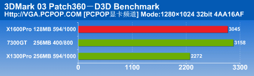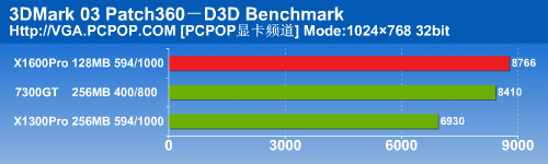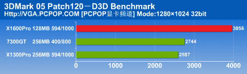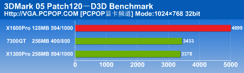 在3DMark05中,X1600Pro12个像素单元的实力得到了完全发挥,以非常大的幅度将另外两款显卡抛在了后面。