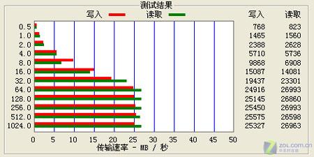 采用USB 2.0接口,读写速度分别为26.99MB/S和25.58MB/S。