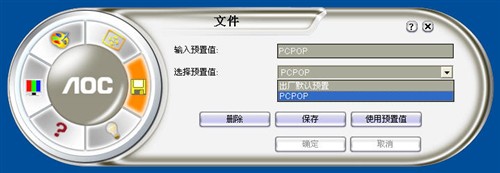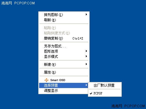 让我们保存预置值之后,可以在桌面上单击右键“选择预置”中一键切换,相当的人性化(笔者只预置了“PCPOP”模式),消费者完全可以多预置几个模式,比如:电影、游戏、图片、文本等。