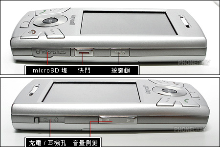E898 二侧配置中规中矩,具备相机快捷键、音量侧键、耳机孔、记忆卡端口等,都是常见的编排方式,薄身也未影响这些按键设计,大小仍适中。