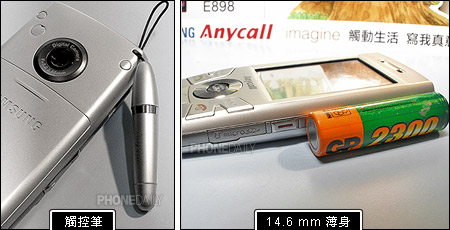 没有了数字键盘,打电话、写简讯,只能用手指或赠送的操控笔。E898 不像 PDA 手机硬要在机身加一个触控笔槽,而以吊饰设计代替,把笔盖挂连笔挂起,具延缩功能的触控笔亦利落有型,让人不免大大称许 Samsung 的独到巧思。