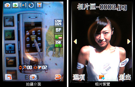 没有了键盘的 Samsung E898,依旧内建 Samsung 06 年新款手机的许多强劲功能,包括黑白用户接口,感觉 cool、对比也鲜明。虽然相机只有 130 万画素,但功能、选项都很充足,支持全屏幕取景,调整 ISO 感光度、变焦、曝光补偿、相片框等等,维持一定的操控乐趣。