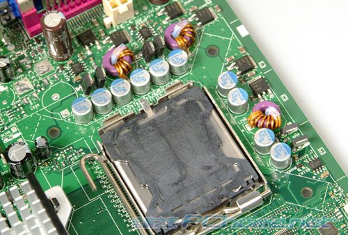在大致了解了这款主板后,让我们详细的看看各个部件。Intel的做工相当的精良各个部件用料十足,看看在CPU附近使用的固态电容就知道了,而电解电容则使用了Rubycon、Nichicon和KZE三大品牌的电容,用料绝对无可挑剔。