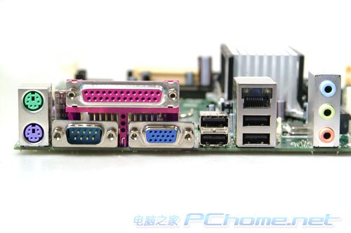 再来看看主板的I/O扩展面板,面板的接口简单明了,PS/2鼠标键盘、VGA接口、4个USB接口和音频输出接口。我们最常用的接口一个都不少。