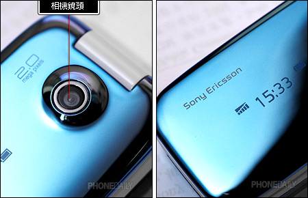 Z610i正面的200万像素相机镜头,在平面的上盖稍微突起,虽有磨损之虞,但在镜面材质上造成额外的阴影效果,算是别有情趣。OLED 单色屏幕可显示时间、日期、信号格数与来电讯息等,在一般待机时便隐藏于镜面材质之下。
