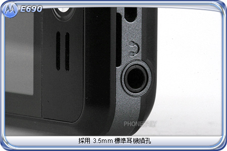 在手机的顶部,MOTO 为 E690 配置了一个 3.5 mm 标准立体声耳机输出孔,用户可以自行更换不同的耳机来欣赏音乐,而这也是继 E2 之后,再度拥有此配备的 MOTO 手机。