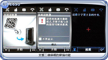 E690 内建了 QRcode 扫描功能,只要进入该功能选项,并将画面中心对准条形码,就能直接读取条形码中的讯息,并登录到讯息的后端网站,省去一层一层浏览网页的繁杂步骤。