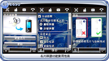 虽然 E690 是一支以娱乐功能为卖点的手机,但商务人士最爱的名片辨识功能也内建其中。只要先手动切换相机到近拍模式,并开启名片辨识功能之后,将画面中的红色边框对准要辨识的名片,再等手机确认名片是否有对齐边框之后即可拍摄。经过反复的测试,在光源充足的环境之下,E690 的名片辨识成功率相当高,约在 90% 左右。