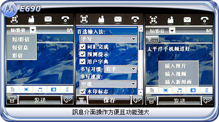 在简讯功能方面,E690 和 E680i 相同,都采用文字简讯与多媒体简讯一体化的编辑接口,操作上相当人性化,但是手写输入依然只能够单框识别,并未提供「机迷」们期待已久的多框连续手写输入功能令人有些遗憾。此外,E690 独立出 3.5 MB 的空间给文字简讯、多媒体简讯以及通讯簿来使用,相信能满足大部分消费者的使用需求。