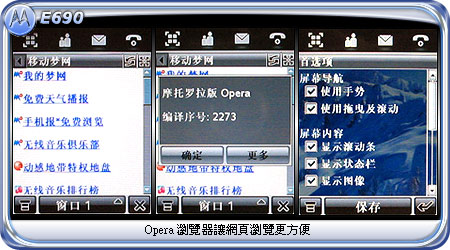 E690 内建广受欢迎的 Opera 浏览器,能够浏览 WAP 以及 HTML 的网页,并能同时开启多个窗口来浏览,使用起来相当方便。