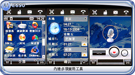 除了 Opera 浏览器之外,E690 还拥有能够开启 Word、PDF、Excel、PowerPoint、JPG 等众多档案的浏览软件「Picsel viewer」。除此之外,E690 还提供了字典、记事本、闹钟、计算器、录音机等日常生活常会用到的功能,用户也可按照个人需求自行安装其它的应用程序。