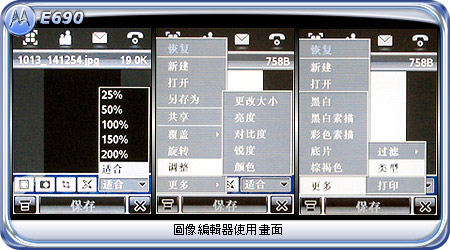 除了上述的实用软件之外,E690 还内建了一款图像编辑软件,能够在图片加上边框以及文字,还能对图片进行缩放、旋转,以及亮度、对比、锐利度、颜色等多方面的调整,在某种程度上弥补了拍摄功能的先天缺陷。