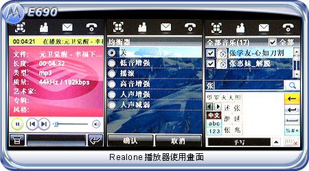 E680 系列手机内建的 Real 播放器一直广受好评,而 E690 则是全新升级到 Realone 的版本。不但能支持 MIDI、MP3、WAV、AMR、WMA、AAC+ 等多种格式的音乐播放,还提供歌曲快速搜寻功能,并有 6 种均衡器模式可以选择,同时也支持背景音乐播放模式。E690 也支持蓝芽 A2DP,让使用者能够享受音乐而不被线路拘束。