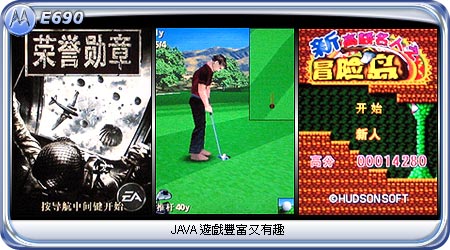 身为一款为娱乐而生的 Linux 手机,E690 自然内建了多款 JAVA 游戏,类型包含战略、动作、运动以及 RPG,每款都拥有精彩的声光效果。虽然在游戏操作方面,少了屏幕上方的按键可以使用,但是全新的 Touchscreen 技术加持之下,透过触控屏幕就能轻松完成游戏里面的各项动作指令,完全不会影响到游戏的操作性。