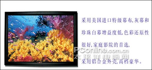 白雪钻石系列豪华画框幕采用美国进口特级幕布,有灰幕和珍珠白幕两种颜色供用户选择。其白幕产品清晰度高,可以准确再现影像,而灰幕对比度表现较好,黑色暗位效果明显。这款产品拥有16:9和4:3等多种尺寸规格可供选择。白雪投影屏幕增益度高,拥有较好的色彩还原度和鲜艳度,其外面框采用的是铝合金外壳,确保安全耐用。尽管在视频效果表现方面还不能与世界知名品牌相比,但其表现足以使其成为国内入门级发烧友的优先选择。