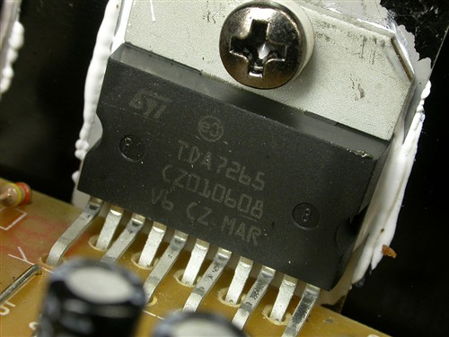 低音通道采用ST原厂的TDA7265芯片。TDA7265功率较大,推力强劲,本身就有不错的控制力,配合电子分频更能彻底发挥其控制力强的特点。从总体效果来看,1875+7265的组合是非常成功的,充分发挥了两种芯片各自的优势,既保证了足够的音响性,又能在播放时很自然的流露出音乐性,采用不同芯片的组合确实是个不错的创意。