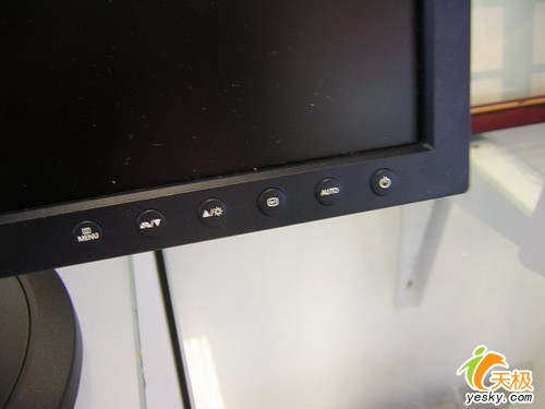 OSD调节按钮像众多产品一样,被设置在底边框的右边,这是符合我们的右手习惯。按钮呈纽扣状依次排开,电源开启时还会泛出淡蓝色的光。