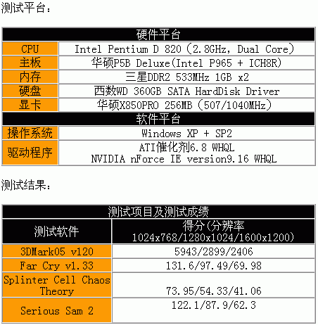 在测试中采用了较主流的Intel平台,测试软件是测试了几个常用的测试软件, 3DMARK 05 v120和目前流行的几个游戏。其中, 3DMark05利用最新DX9.0渲染的图形着色引擎为基础,引入了Pixel Shader 2.0以上支持的基准测试,在DirectX 9.0c下可以得到精确的性能和图像品质资料。华硕X850PRO凭借着超高的默认核心频率和显存频率、更多的渲染管线数量以及256bit显存位宽带来的巨大显存带宽优势,在3DMark05的测试中达到并超过了预期值。在游戏测试中,X850PRO能顺利的完全各个主流游戏的测试,作为一款低端,而且还是超低价的产品,这次测试的结果还是让人满意的。