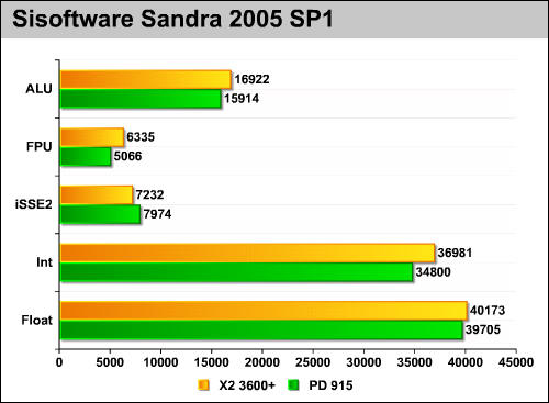 SiSoftWare Sandra是一套功能强大的系统分析评测工具,拥有超过30种以上的测试项目,主要包括有CPU、Drives、CD-ROM/DVD、Memory、SCSI、APM/ACPI、鼠标、键盘、网络、主板、打印机等,全面支持当前各种芯片组和AMD、Intel平台。在SiSoftWare Sandra的测试中,测试成绩是纯理论性能的表现,和实际使用中的表现可能有很大的不同。在这个测试中,X2 3600+在浮点和整数预算能力上要领先于PD 915,而且得益于内置内存控制器,X2 3600+的内存性能(int和float两项)成绩也要优于PD 915,但在和多媒体运算能力相关的iSSE2项目测试成绩上,凭借对多媒体应用上更强的能力,PD 915的成绩要领先X2 3600+一些。
