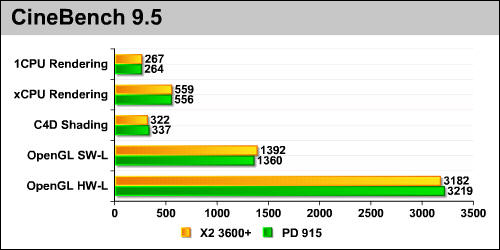 CineBench 9.5是用于测试CPU在多任务环境下应用的一个软件,其中前两项测试是分别基于单核心和多核心的测试,后面三项是系统显卡性能的测试。从这个测试中,我们可以看到X2 3600+以微弱的优势在CPU性能测试项目中取得领先,而在图形性能测试项目中则互有优劣。