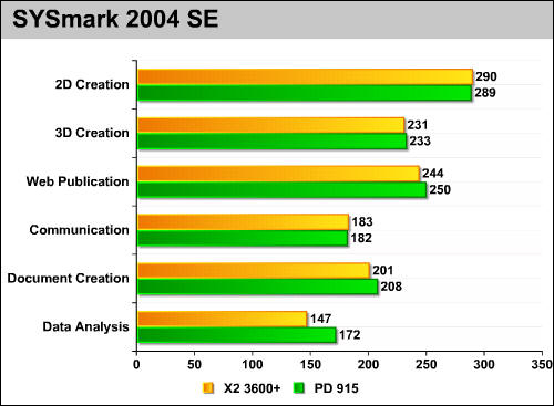 从这个测试的成绩来看,无论是在数字内容编译及处理测试中(前三项),还是在在办公室应用程序测试中(后三项),以PD 915搭建的系统都领先于X2 3600+系统,但优势并不会十分明显。总体而言,PD 915系统的性能要稍微优胜一些。