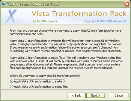 首先给大家推荐的是Vista Transformation Pack(上图),它是一套能够将Windows XP/Server 2003操作系统,完美地模拟成Windows Vista的软件。现在这个软件是一个比较好用的模拟Vista的软件,推荐大家使用。