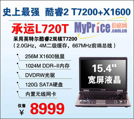 最为强劲的Intel酷睿2代Merom处理器T7200,X1600高端独显、超大内存、硬盘以及仅9K的售价,神舟在主打双核上依旧保持强势,而L720T的豪华配置对于很多采用T7200是一个非常大的威胁。