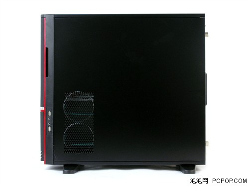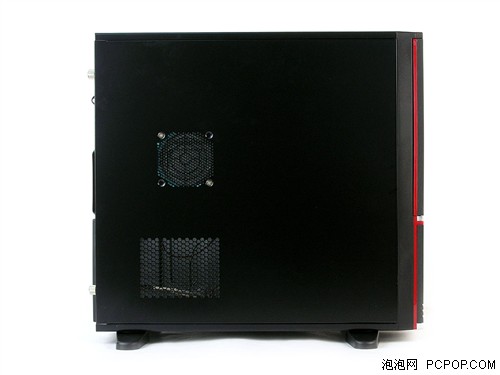 在机箱的右侧面,我们可以看到还有边长为9CM的正方型散热孔,为了防止散热孔受到挤压而变形,它使用挤压工具将其凸出,猛一看的话您可能还会以为这是两个“圆”!当然,这样的结果可以让这两个散热孔不易被压变形。