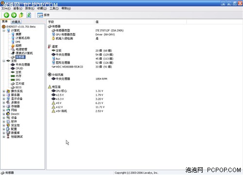 首先来看一下开机5分钟后的“待机温度”。CPU的温度为54度,显卡的温度为52度,应该说这两个温度都不算高,我们在裸机测试时的温度也不比这个小。