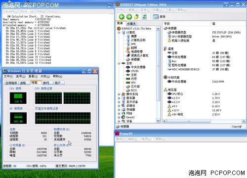 烤机软件我们使用了“Prime 95+Super Pi”,即便是目前再强的四核CPU,CPU占用率也得百分之百!果然,在运行15分钟后的成绩之后,CPU的温度从54度涨到了64度,其它各点的温度变化也不小。不过对于P4 EE 3.73GHz这样的处理器来说,64度还是可以接受的。