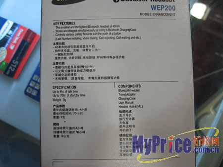 三星WEP-200支持蓝牙V1.2标准,并向下兼容V1.1,可以和目前大部分主流的蓝牙手机匹配使用。它支持免提功能,通话清晰,最远距离为10米。它配备的可充电式锂电池,待机时间为200个小时,通话时间为8个小时,在工作时间方面WEP200的表现可以说是很优秀的。