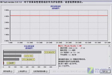 从测试看优盘的成绩不是很理想TF卡插在上面仅有4.1M/s的平均读取速度,但CPU占有率很低仅有2%,而我们通过转接器单独将TF卡插在SD读卡器上结果则非常理想,达到了理论传输的7M/s,CPU占有率居然是0%十分夸张,不过不管优盘还是单测这款产品的速度都非常稳定没有任何波动。