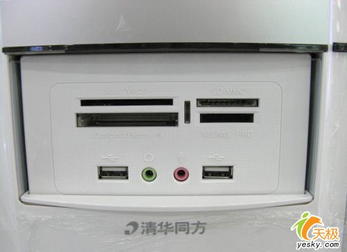 同方真爱S7300采用了最新的具有时尚外观的机箱,整体为银灰色,前面板中部为白色。主机箱表面全部经过剖光处理,做工十分细腻,光泽明显。较之以前的更显豪华。面板之间的接缝处很小,官方资料只有0.3mm,这个数据远低于业内标准,从这点上可以看到同方在PC制造方面的工艺还是不错的。