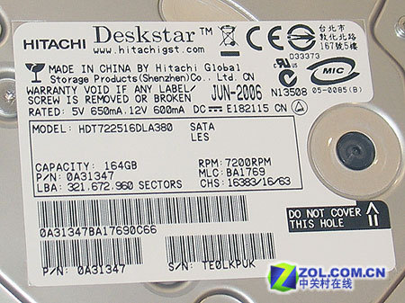 这款硬盘的编号是HDT722516DLA380,其中“T7225”代表Deskstar T7K160系列硬盘,“380”中的3表示SATA-2.5(外部传输速度高达300M/S),P/N号为0A30786,S/N号为T4ENX6MC。此外,该硬盘的产地为中国(CHINA),生产日期为2006年6月,工作电压为5V(650mA)/12V(600mA)。硬盘容量是160GB,转速为7200 RPM,高速缓存容量为8M Cache,单碟容量由80GB增大到了160GB,平均寻道时间为8.5 ms,标称最高内部传输速率为94.6MB/s,工作时噪音仅为26db。T7K160系列还支持NCQ技术(全速命令队列)。
