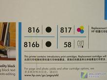 不过机器随机配备只有一黑(HP 816)一彩(HP 817)两个墨盒,如果想实现六色打印,用户需要单独购买一个HP 58号照片墨盒,搭配817号墨盒从而实现六色打印。