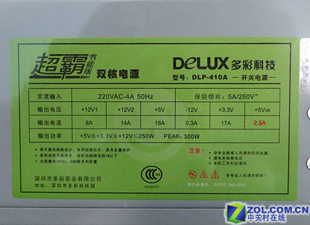 多彩DLP-410A铭牌标示额定功率250W,峰值功率达到300W。电源按照ATX 12V 2.2版本规范设计而成,具有2路+12V输出。增强了+5Vsb的供电能力。