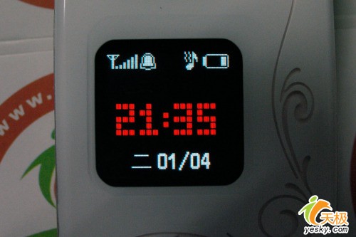 在手机的外屏上,这款E428采用了一块正方形的OLED屏幕,分辨率为96×96象素。虽然没有采用常见的彩色外屏,但是我们认为采用OLED冷光屏幕才是现在手机外屏设计的主流趋势,相比TFT彩色外屏,OLED有着更为清晰,更为省电,更为便于阅读的优点。