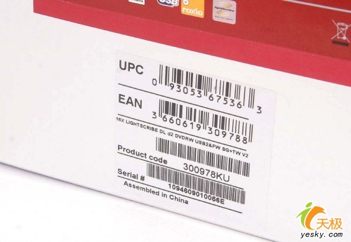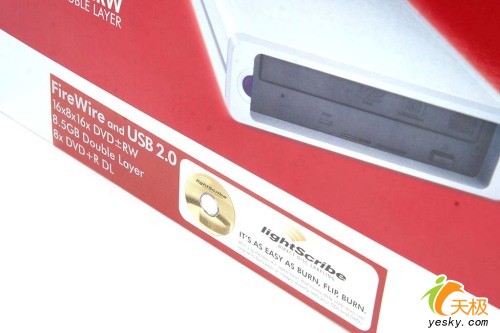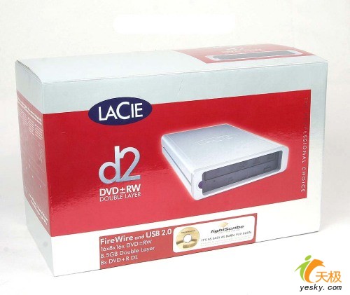 莱希(LACIE)外置DVD刻录机的包装相当硕大,整个外包装与消费级市场中的外置刻录机相比大了三分之一。包装风格也相当简洁,红色与银色的搭配风格并不算实尚但相当实在。由于支持光雕打印,因此LightScribe的光雕标志在外装上也有所体现,另外我们还可以从包装上看到此款产品的型号:莱希(LACIE)D2 300978KU,产品产地为中国。