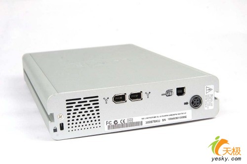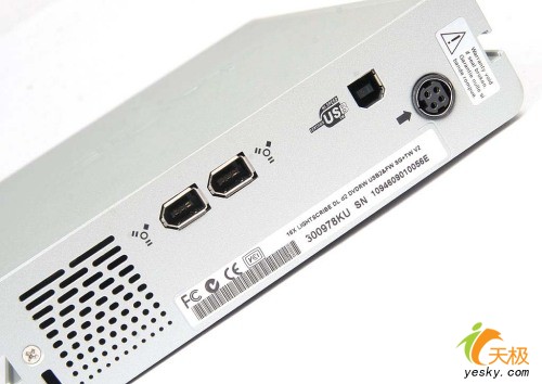 莱希这款光雕全兼容刻录机提供两个IEEE1394、一个USB2.0以及一个四针的电源插座接口,丰富的接口方面不同用户的使用。另外,还提供了一个散热口。