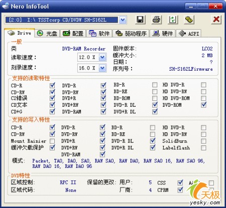 我们用Nero Infotool检测到的莱希光雕全兼容刻录机的基本信息,可以看到,这款产品的兼容性相当丰富,除了不支持BD蓝光盘片外,能够兼容当前市场中主流的盘片。在提供的产品型号这一栏中,我们发现型号是:SH-S162L,这是三星刻录机的一款产品的型号,可以确定这款莱希的产品采用的是三星的机芯。