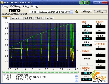 上图测试的成绩还是相当令我们满意的,以6.72X的超刻速度平滑上升,最大刻录速度为15.55X,平均刻录速度11.48X,刻录曲线相当平滑,刻录耗时:6分34秒。