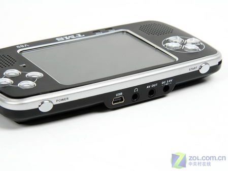 产品的接口多位于顶部:USB插口、耳机插孔、AV-OUT插孔和电源适配器插孔均位于此;两端有游戏开始键和电源开关键,这两枚按键的手感偏硬。